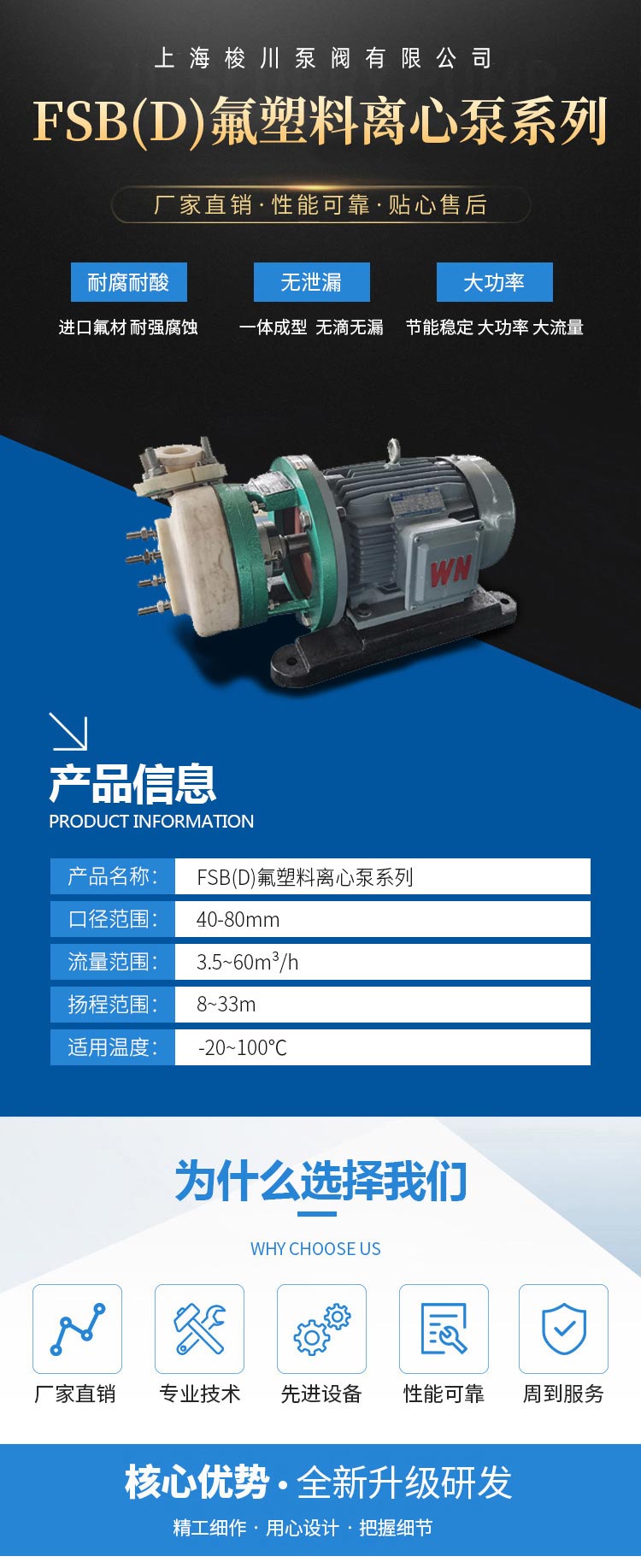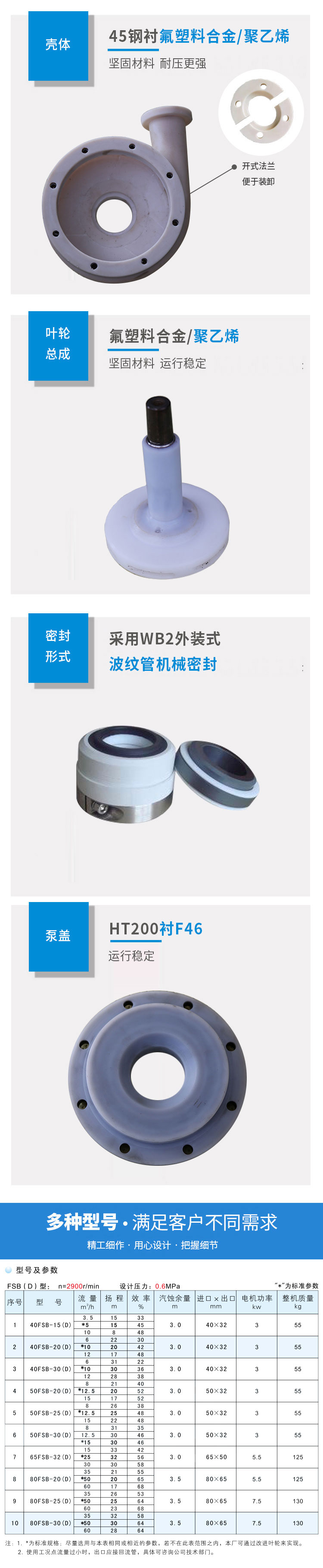 FSB和FSB-D型離心泵,過(guò)流部件全部采用氟塑料合金制造結(jié)構(gòu)緊湊、操作簡(jiǎn)單、價(jià)格低廉。兩種型號(hào)的泵殼、葉輪、機(jī)封等均可互換使用,深受農(nóng)藥、電子、造紙等行業(yè)的歡迎。