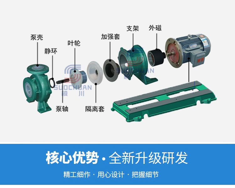 防漏設計取消了軸封,利用磁力耦合間接驅動,有效消除了滴漏的煩惱,絕不污染場地。由于泵的過流部分選用“氟塑料合金”制造??蛇B續輸送任意濃度的酸、堿、強氧化劑等腐蝕介質而毫不受損。
