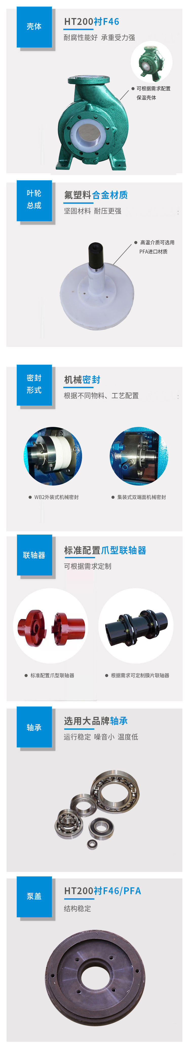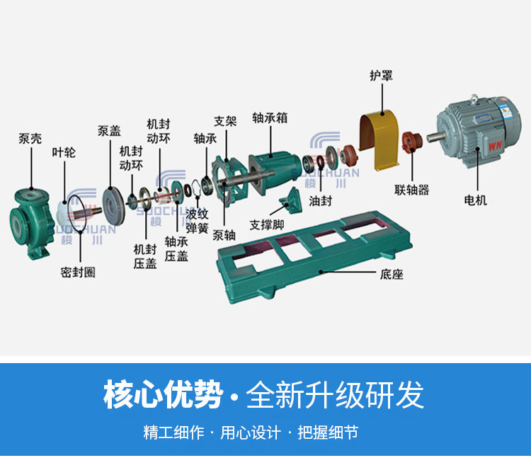 泵體和泵蓋均采用金屬(HT200)基體內(nèi)襯氟塑料,葉輪采用金屬嵌件(WCB)外包氟塑料合金壓制成型。優(yōu)點:耐腐蝕性范圍廣,強度高,經(jīng)久耐用。